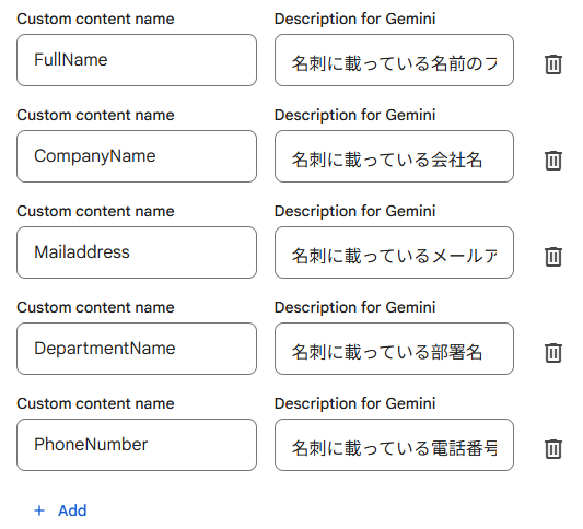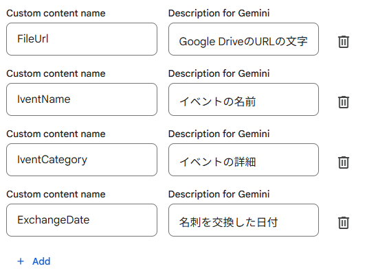 そして、Custom content nameとDescription for Geminiには以下の表のとおりに設定します。順番は順不同です。