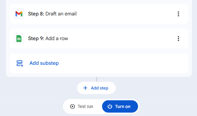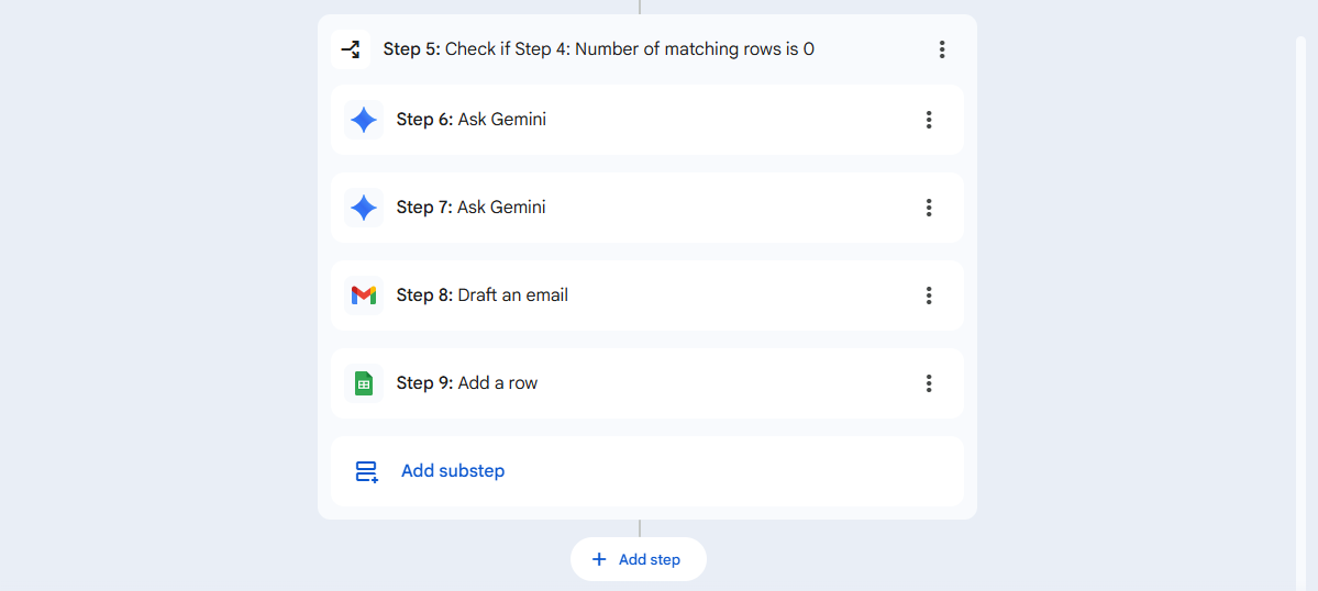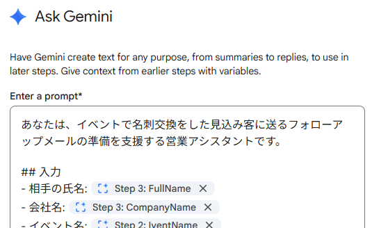 続くアクションでは、Step4のGet sheet contentsのステップの重複確認の結果をもとに「Check if」ステップで確認を実施します。そして、「Ask Gemini」ステップで名刺情報から抽出した会社名から最新の情報を収集し、連続した「Ask Gemini」ステップではお礼メールの本文の内容を生成します。そして、「Draft an email」ステップではお礼メールの下書きを作成し、最後の「Add a row」ステップで名刺を追加して終了となります。