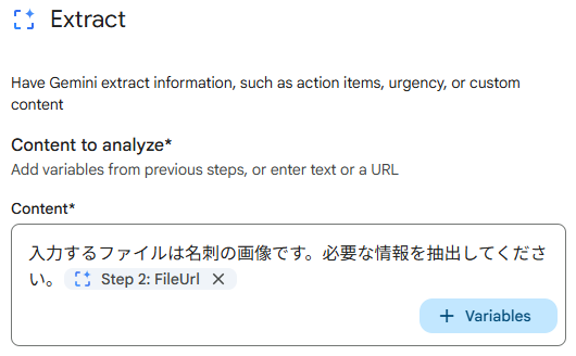 続いて、Step3ではもう一度「Extract」ステップを作成します。このステップでは名刺の画像から情報を抽出するため、Contentの欄には「入力するファイルは名刺の画像です。必要な情報を抽出してください。」と入力してからVariablesから「Step2: FileUrl」を追加します。