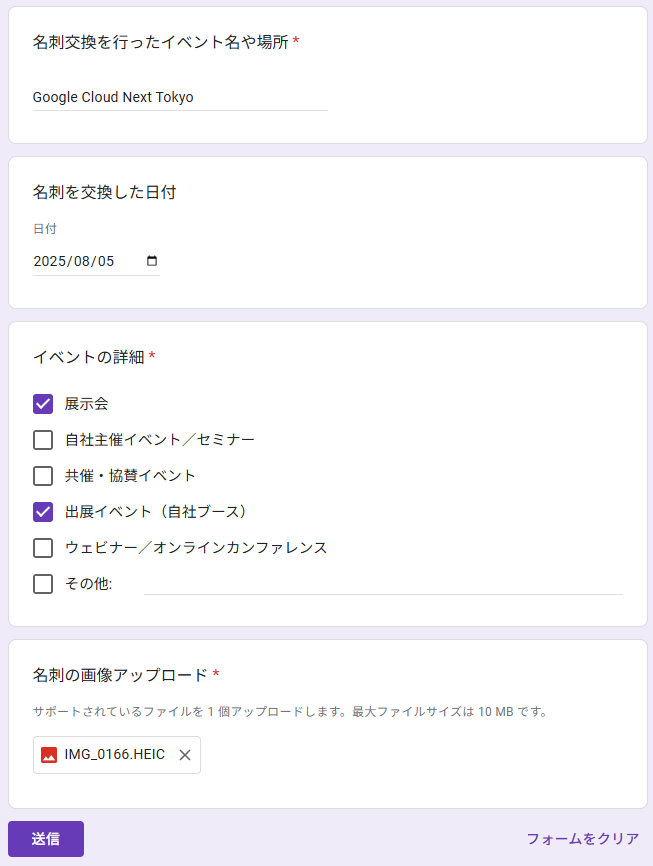 今回作成したエージェントはGoogleフォームに回答が来たときに動作するようにしています。今回はテスト用に自分自身の名刺を利用して動作確認をします。まず、以下のようにGoogleフォームに回答しました。