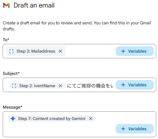そして、Step8ではCheck ifのサブステップとしてお礼メールの下書きを作成するための「Draft an email」を設定します。Toの欄にはVariablesから「Step3: Mailaddress」を、Subjectの欄には「【御礼】[Step2: IventName]にてご挨拶の機会をいただきありがとうございました」を入力します。Messageの欄にはひとつ前のStep7の生成内容をそのまま入れるため、Variablesから「Step7: Content created by Gemini」を追加してください。それ以外の欄はデフォルトの空欄のままとします。