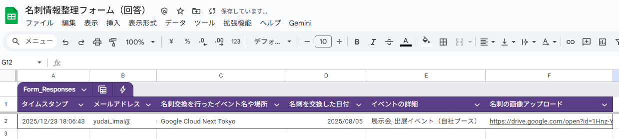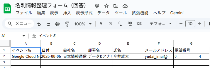 名刺情報のシートにも抽出された名刺情報が追加されているため、想定通りの動作となっています。