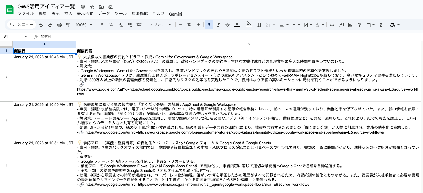 本エージェントは、平日の朝にGoogle Workspaceの最新かつ実務に直結する活用事例を収集・要約し、Google Chatへ自動配信するとともに、その配信履歴をGoogle Spreadsheet上で一元管理する仕組みです。