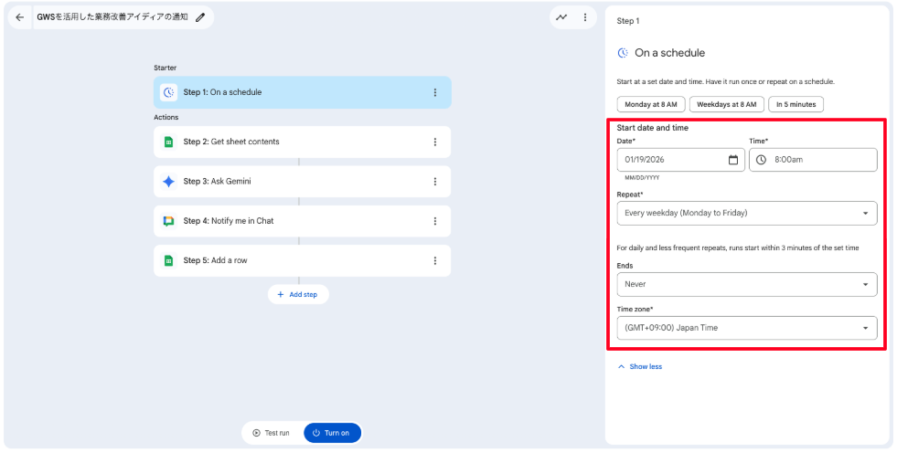 開始日は2026年1月19日とし、平日の毎朝8:00に通知が送信されるようにします。