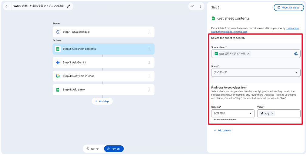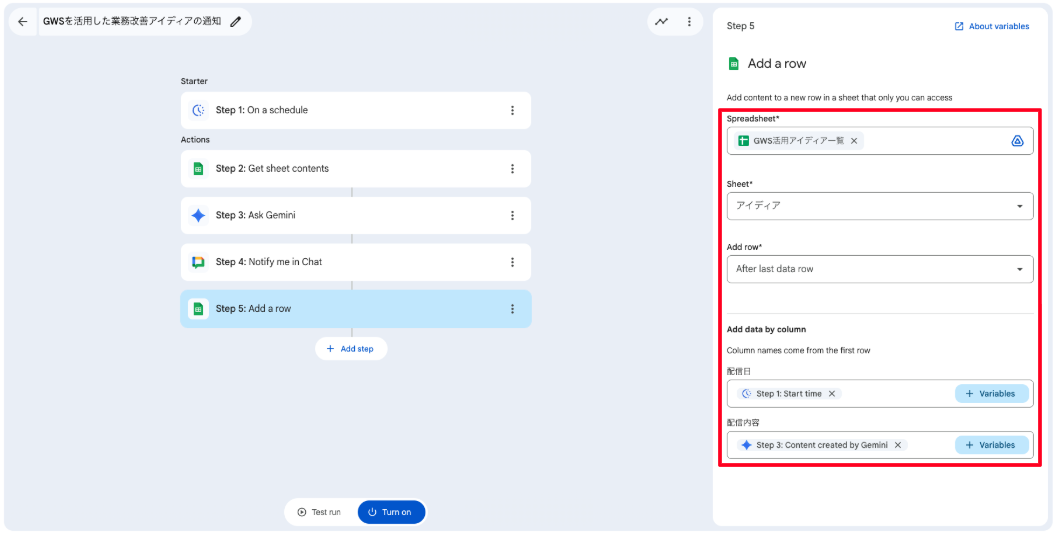 Add data by columnでは、「配信日」列にStep1の実行開始時間を、「配信内容」列にStep2の出力内容が記録されるように項目を割り当てます。