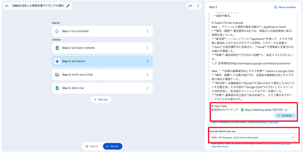 「Enter a prompt」欄に以下のプロンプトを入力し、「Sources Gemini can use」は「Web, Workspace, and connected apps」に設定します。[[[]]] で囲まれた箇所は「+ Variables」をクリックし、Step2の変数をそれぞれ割り当ててください。