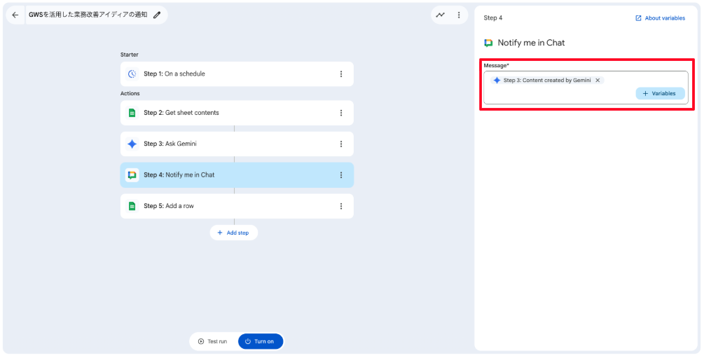 「Message」に「+ Variables」をクリックし、Step3の変数をそれぞれ割り当ててください。