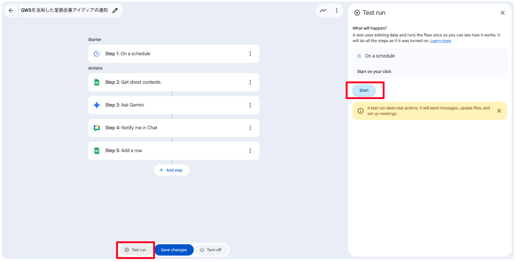 「Test run」と「Start」をクリックし、エージェントが想定どおり動作するかテスト実行します。