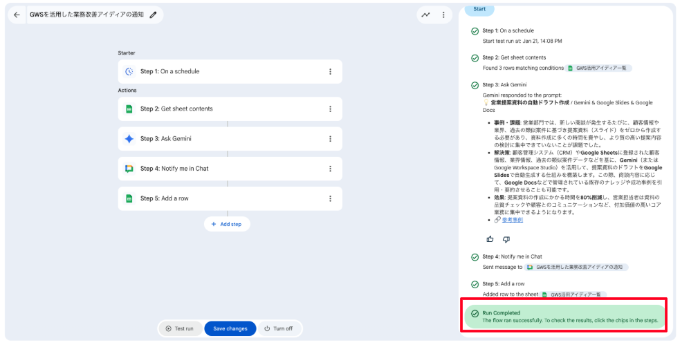 | 実現すること | Google Workspace StudioとGeminiを連携させて運用工数ゼロで毎日具体的な活用事例を社内チャットへ自動配信し、組織全体の生産性を向上できます |