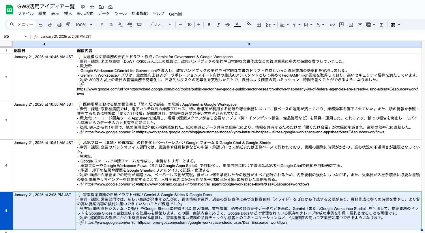 1. **対象**: Google Workspace(Gemini, Docs, Sheets, Meet, AppSheet, Chat等)を活用した、実在の成功事例または一般的な成功パターンに基づく改善案を提示する。Google Workspaceのみで実現できる事例としてください。すでに「「配信済みのアイディア」は対象外としてください。参考リンクのない情報も必ず対象外としてください。