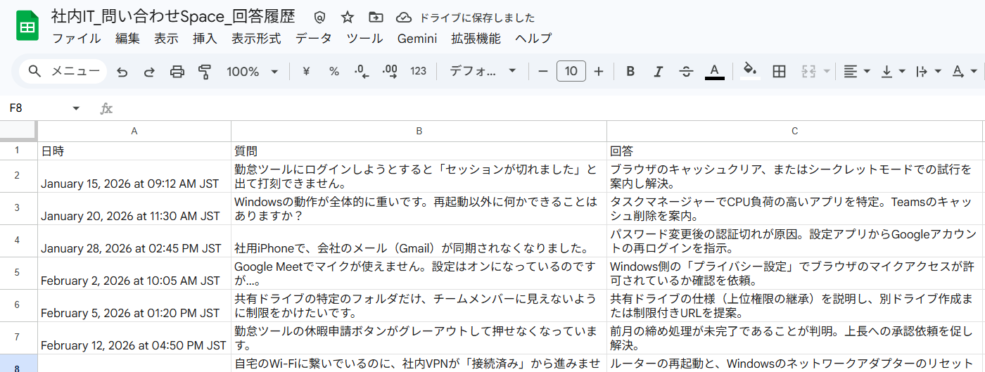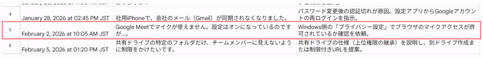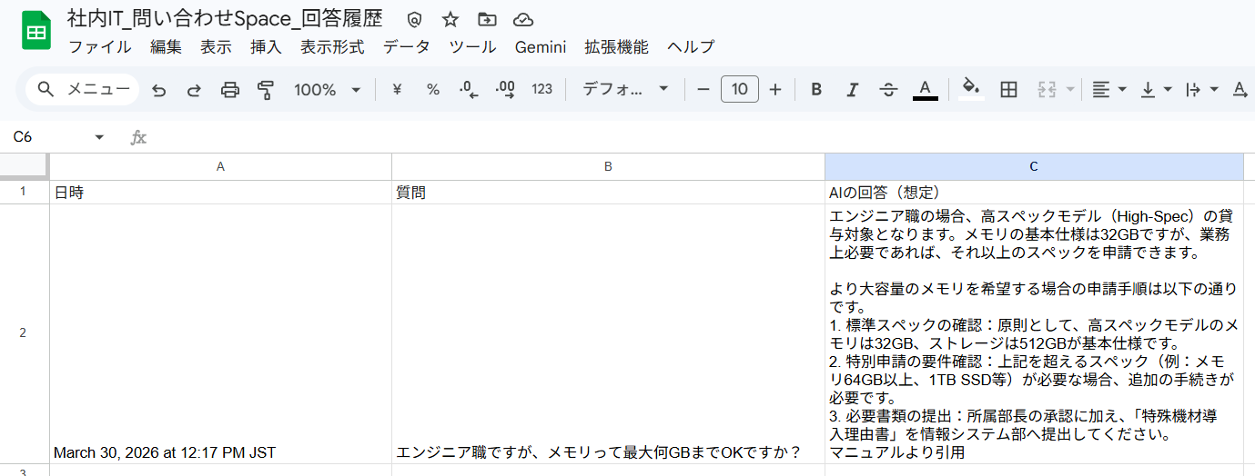 また、過去事例に回答が無い場合は、Google Drive内で指定したファイルを深掘りすると同時に、質問内容をスプレッドシートへ自動で記録します。