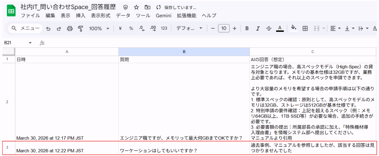 シート構成:「日時」「質問」「回答」の3列を作成します。