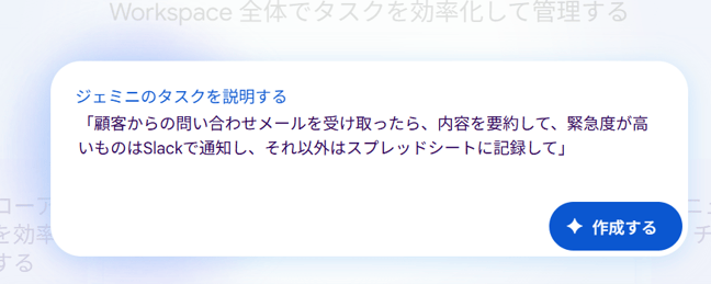 「顧客からの問い合わせメールを受け取ったら、内容を要約して、緊急度が高いものはSlackで通知し、それ以外はスプレッドシートに記録して」と入力後、「作成する」を押下します。
