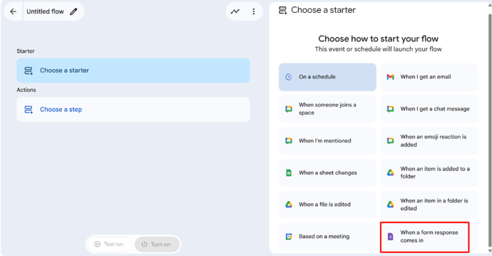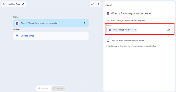 フォーム送信をトリガーにエージェントを起動します 「When a form response comes in」を起点(トリガー)として設定します。これにより、回答が届いた瞬間にリアルタイムで処理が動き出します。