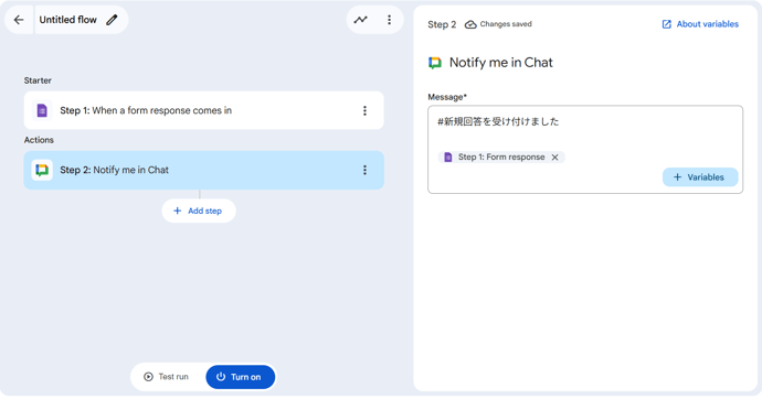 「#新規回答を受け付けました」など記載し、「+Variables」->「Form response」を選択します。