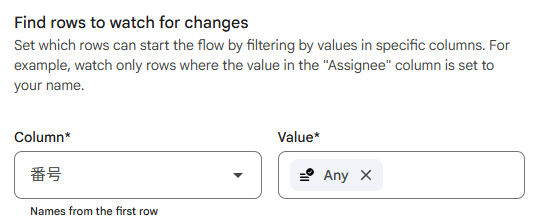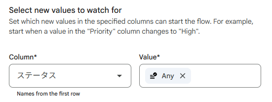 今回の場合、WBSのステータスが変更された場合に通知する、というエージェントを作成したいので、Columnに「ステータス」を設定し、Valueは「Any」のままにします。これで「ステータス」列が変更されたときにフローを開始出来ます。