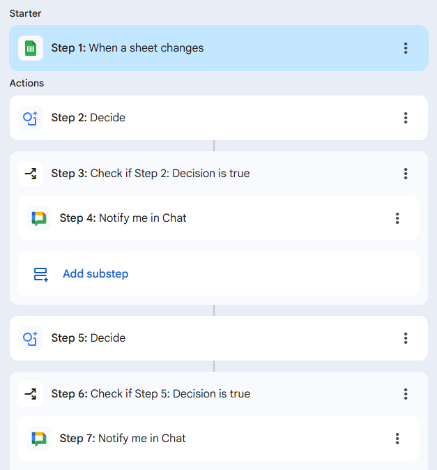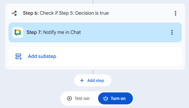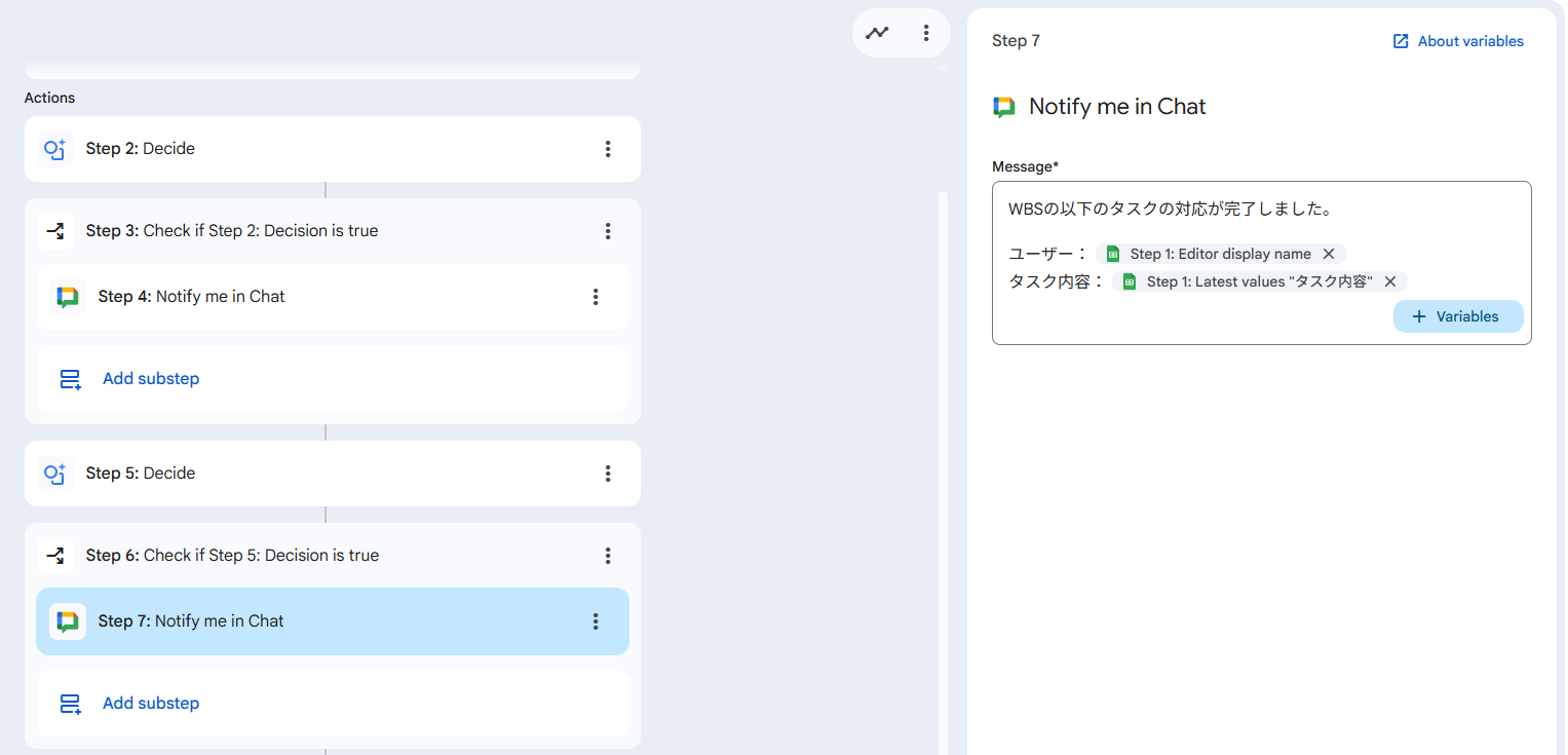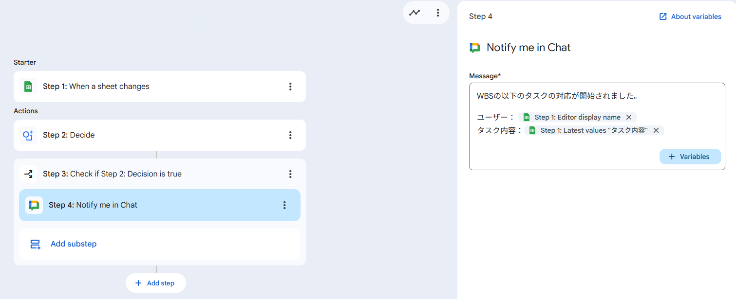 「Add substep」から「Notify me in Chat」を追加し、タスクのステータスが「対応中」に変更された際に自分に送りたいメッセージを入力します。今回の場合、対応開始した旨と、+Variablesからスプレッドシートを更新したユーザーネーム(Step1: Editor display name)・更新された行の「タスク内容」列の値(Step1: Latest values "タスク内容")をメッセージに記載しました。
