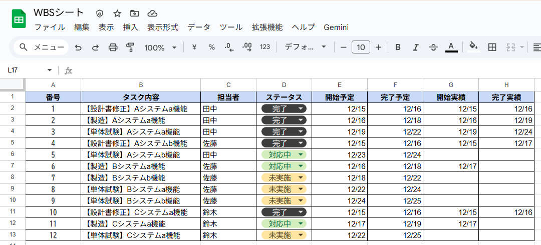 - 利用アプリ:WBSを記載しているスプレッドシートが事前に用意されていること。