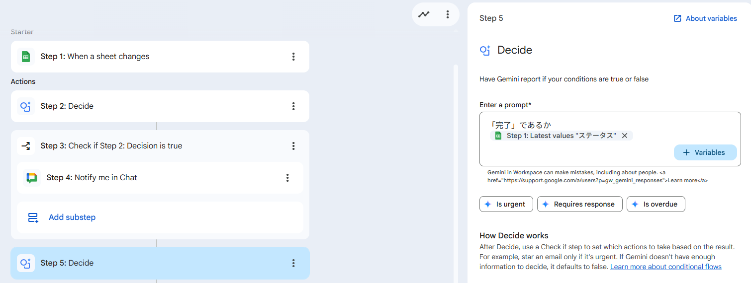 Step5はStep2のプロンプト入力欄の「対応中」を「完了」に変えたものを入力、Step7はStep4のメッセージをステータスが完了になった場合のものに変えるだけです。