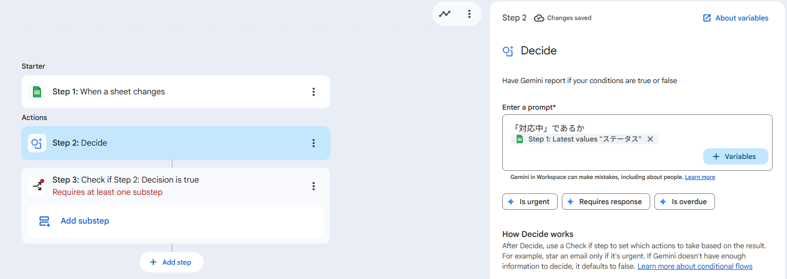 まずは更新されたステータスが「対応中」であるかを判定したいので、プロンプト入力欄(Enter a prompt)に「『対応中』であるか」を入力し、+Variablesから「Step 1: Latest values "ステータス"」を選択して追加します。