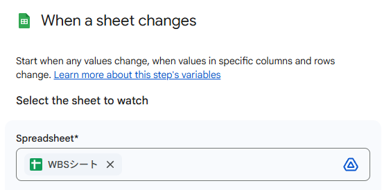 エージェントの編集画面の「Starter」から「When a sheet changes」を選択し、spreadsheetに先ほど用意したスプレッドシートを指定します。