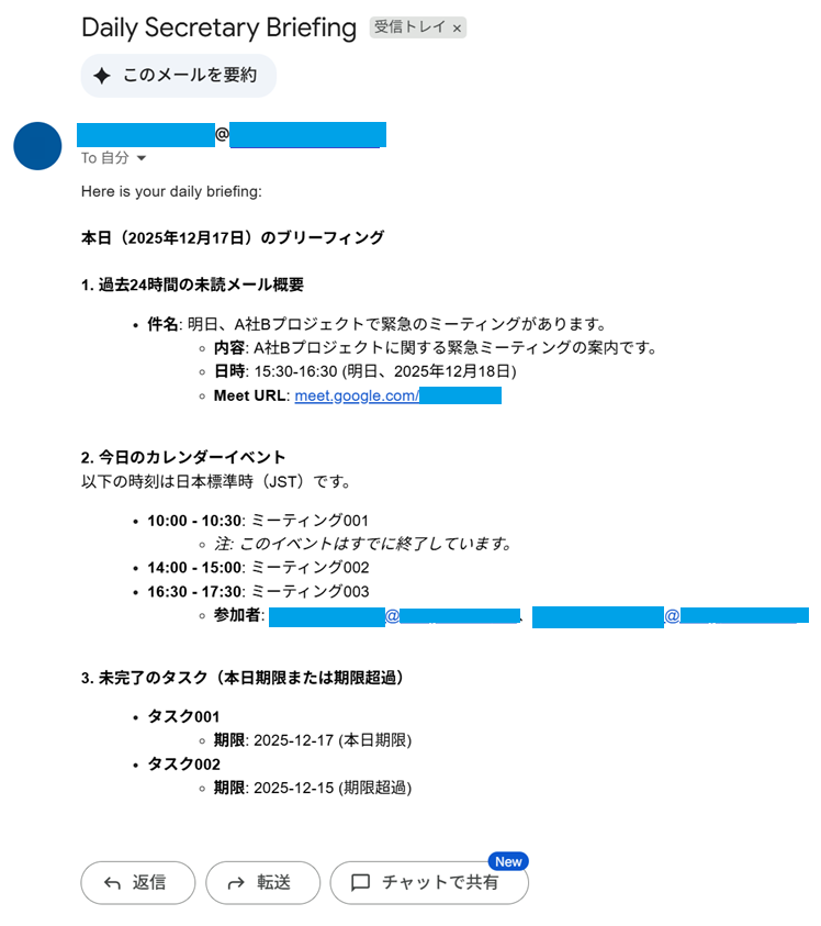 毎朝、下記の内容を含めたサマリーを、まとめてメールでお知らせしてくれるようなフローを作ってくれたようです。