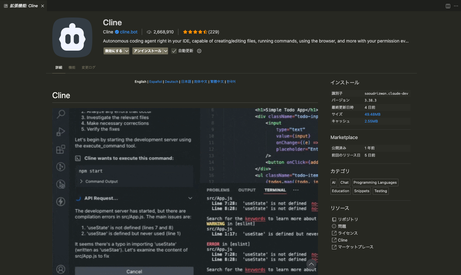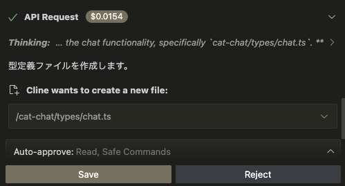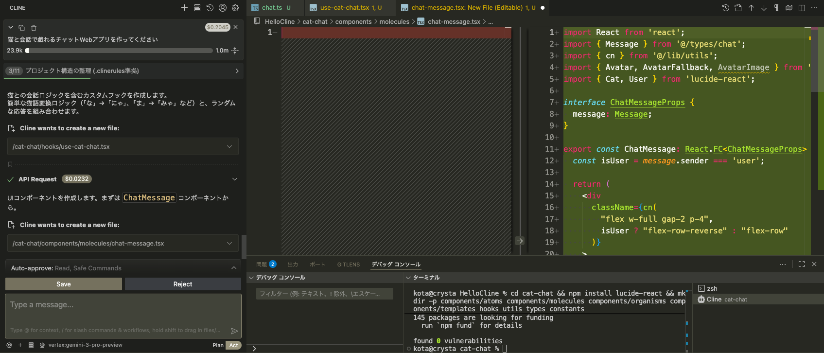 作成がスタートすると、clineが色々考え作成案を作り、それでよいかチャットやターミナルで確認を求めてきます。内容を確認し、問題なければそのまま進めてください。