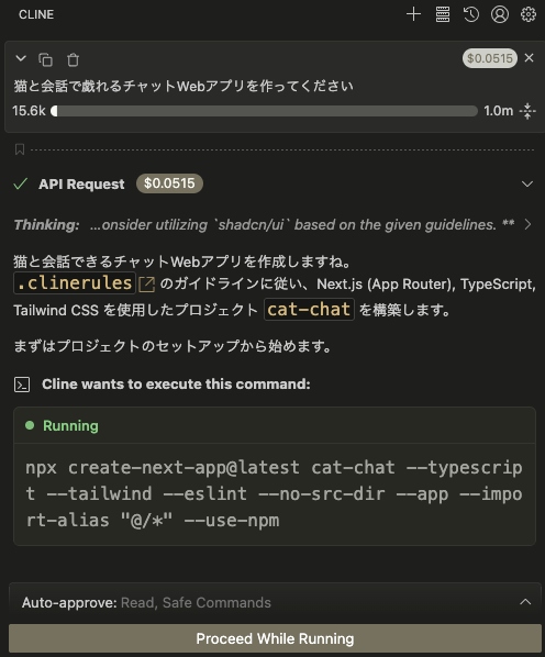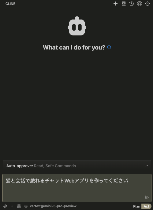 Clineのチャットに指示を入力し、作成をスタートしましょう。