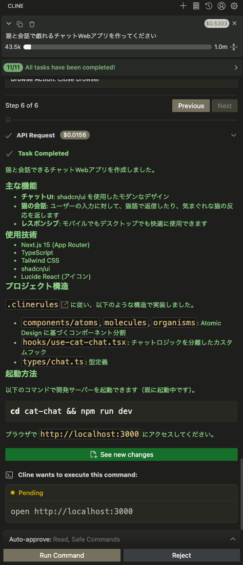 今回はClineへの指示は一言だけでしたが、それでもしっかりと動くアプリを製造してくれます。すごいですね!実際の開発業務では様々な仕様があるかと思いますが、それらもプロンプトで与えることで、こちらの意図をくみとって製造を進めてくれる頼りになるエージェントです。 このようなAIエージェントの登場で、開発業務は大きくスタイルが変化したと実感してます。