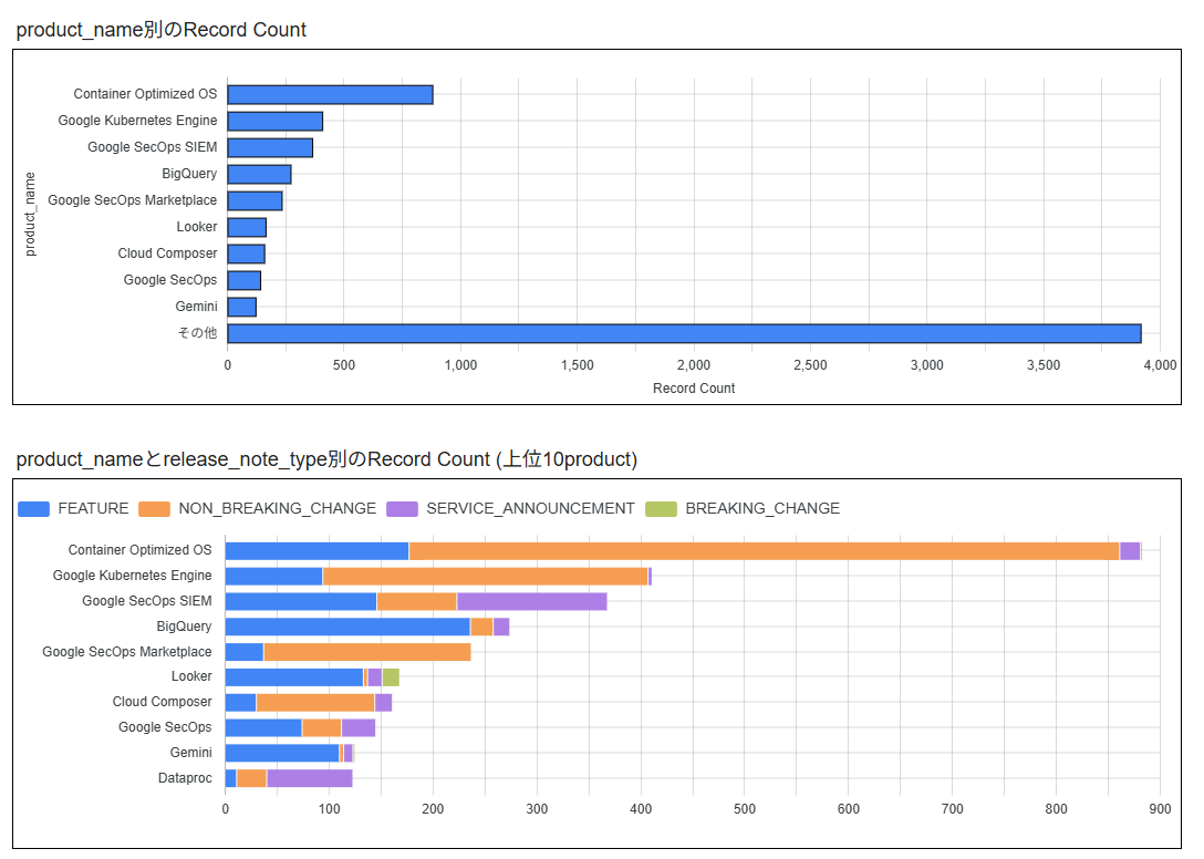 今回は機能追加と機能変更に注目し、障害やその修正を除外したいため、releace_note_typeが 'FEATURE', 'SERVICE_ANNOUNCEMENT', 'BREAKING_CHANGE', 'NON_BREAKING_CHANGE'であるものを調査します。