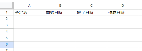 ①スプレッドシートに予定名・開始日時・終了日時・作成日時のフィールドを作成します。