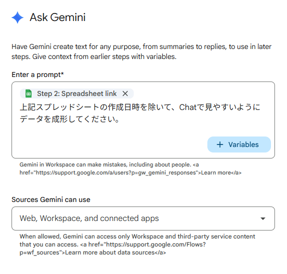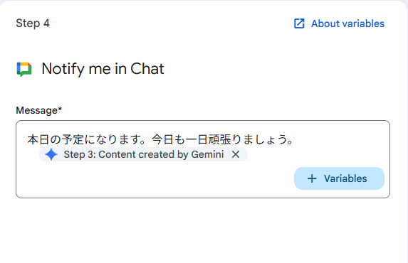 「+ Variables」からGeminiの変数を選択することで、回答内容を出力することができます。