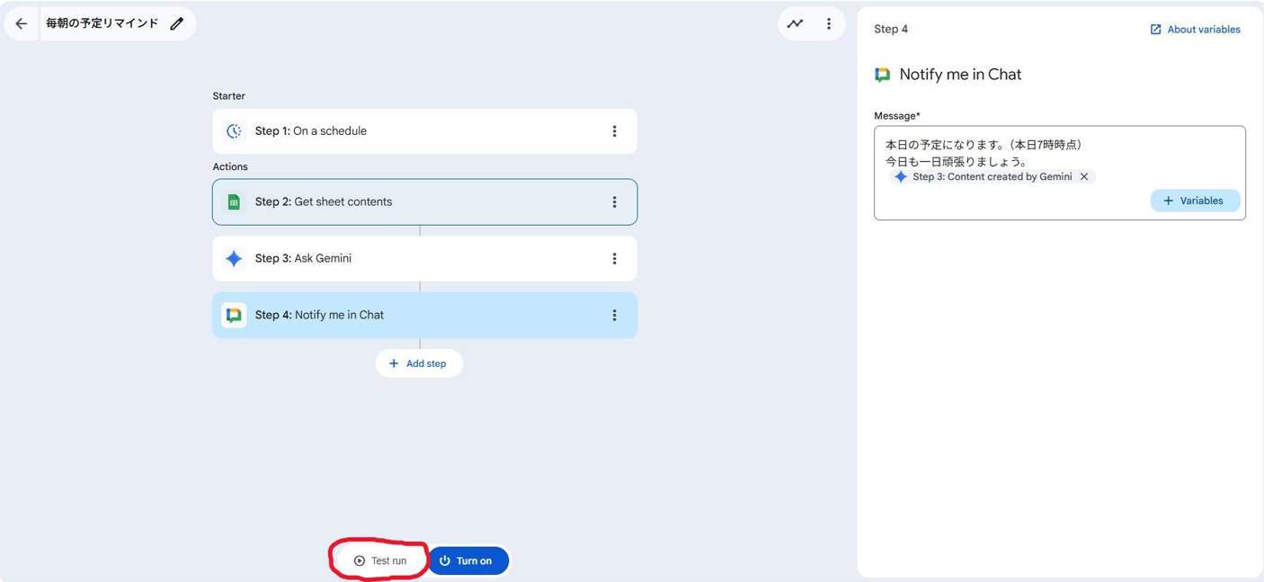- 「Test run」から、「On a schedule」の時間を待たなくてもアクションの動作確認できます。