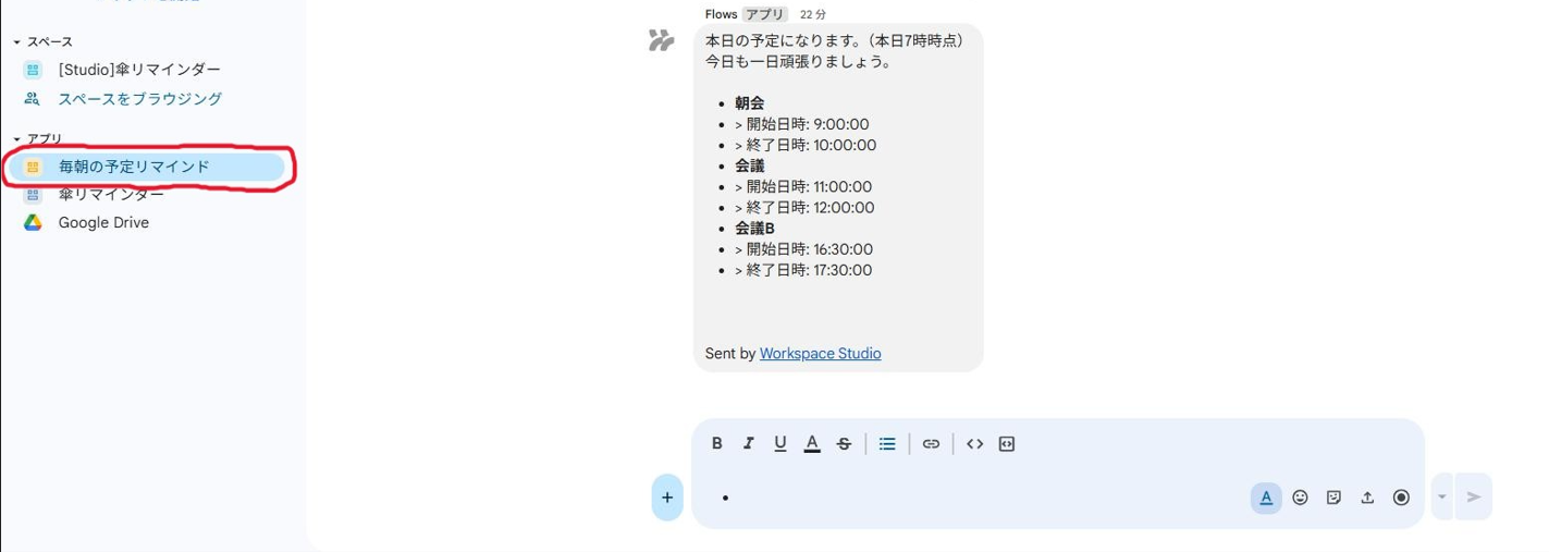 - 出社・始業時にGoogle ChatのDMを開くだけで、その日の重要な予定(会議、締め切りなど)を瞬時に確認できます。
