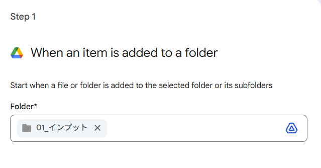 それではまずStarterで「When an item is added to a folder」を選択し、Folder*に 「01_インプット」フォルダを指定します。