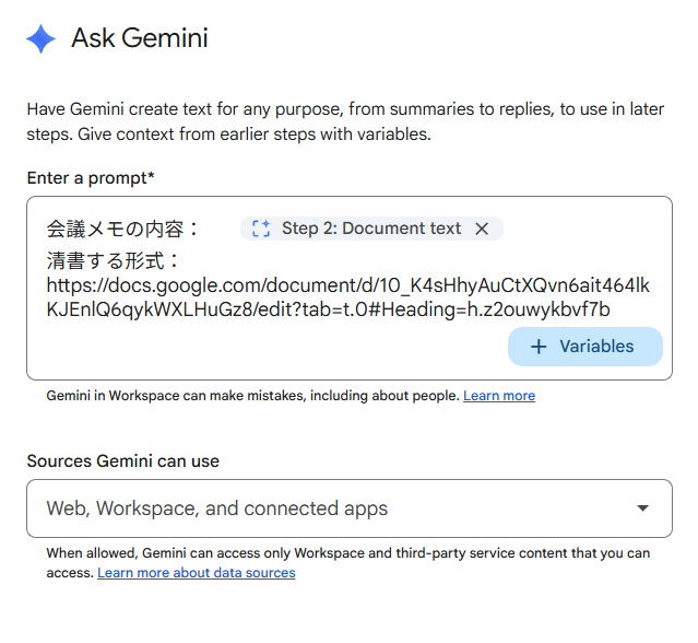 次のStep3のGet sheet contentsステップではGeminiに清書を依頼します。