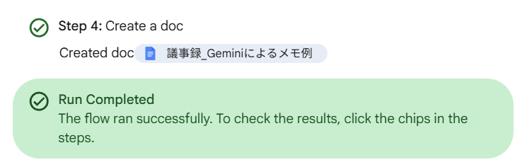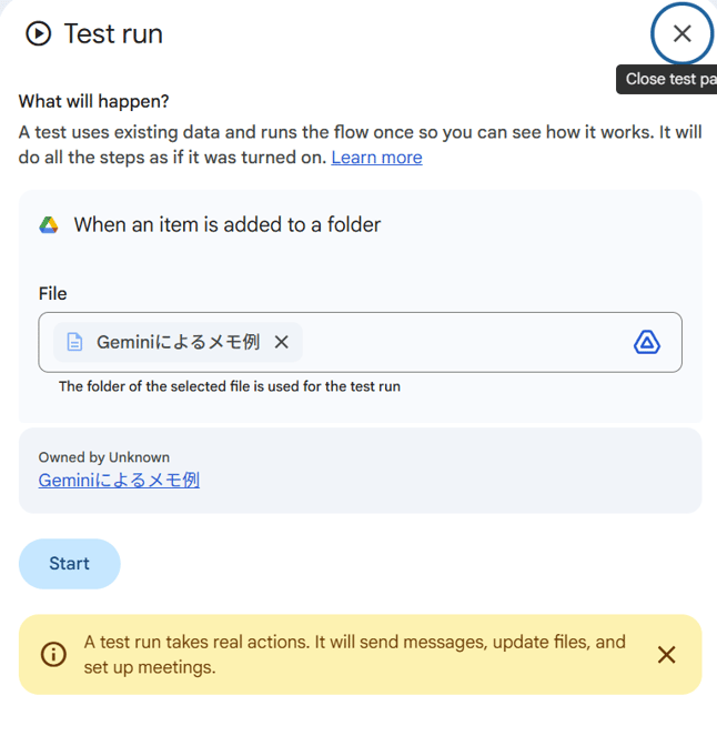 予め用意しておいた”Geminiによるメモ例”がフォルダに格納されたときを想定してテストできることを確認して、Startのボタンを押してみます。