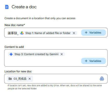 最後にstep4のCreate a docステップでは作成される議事録の保管場所を設定します。