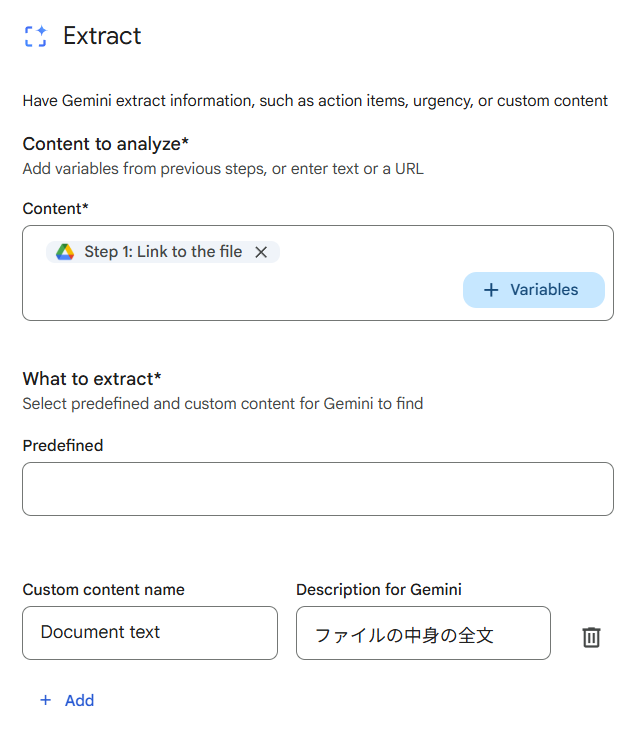 Custom content name に 「Document text」 、Description for Gemini には「ファイルの中身の全文 」と入力します。